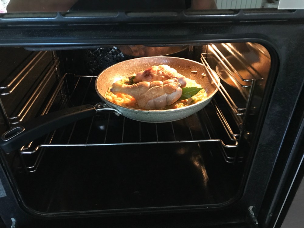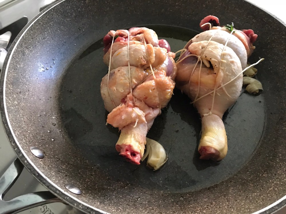 5. In una padella soffriggere con due spicchi d’aglio in camicia e dorare la pelle delle cosce.